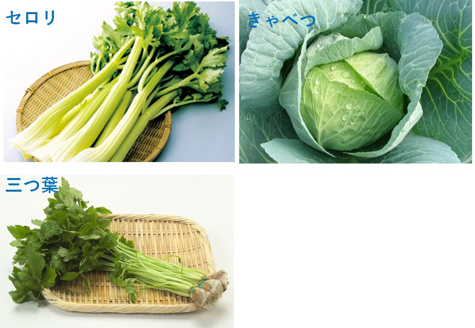 三つ葉 日本に自生していた野菜で、古くから春を告げる野菜として知られています。1本の茎に3枚の葉が付いている「三つ葉」は、さわやかな香りが特徴です。出回っているミツバの形態は3種類あります。糸ミツバは、青ミツバとも呼ばれ、根元まで緑色、1年中水耕栽培されています。根ミツバは茎の下部が白く風味が強め、根も食べることができます。切りミツバは、光を当てずに軟化栽培したミツバの根元を切ったもので、関東では雑煮などによく使われます。