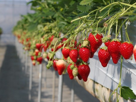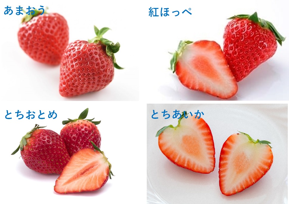 あまおう あまおうは比較的にサイズが大きいのが特徴、見た目も丸みがあってかわいらしい形。果肉はかためで果汁が多く、甘味と酸味が調和して風味のよい味わいです。名前は、県内での公募によって命名されました。「赤い」「丸い」「大きい」「うまい」の頭文字を合わせたもので、「甘いイチゴの王様になれるように」との意味が込められています。全体的にしっかりとしたイチゴの風味が楽しめ、大きいので口の中いっぱいに満たすことが出来ます。