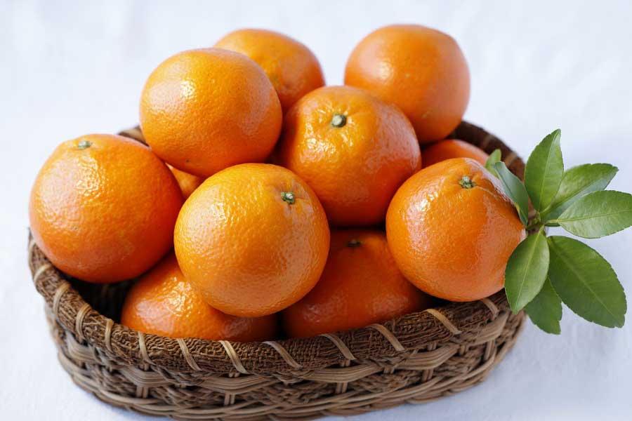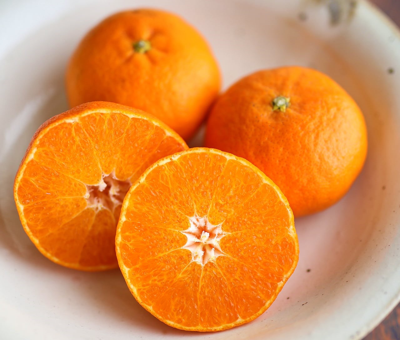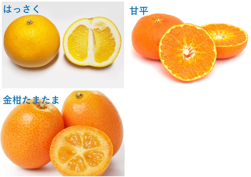 甘平 「甘平」は、愛媛県の果樹試験場が「西之香」と「ポンカン」を交配して育成した柑橘です。濃い橙色の果皮は薄くてやわらかく果肉は鮮やかなオレンジ色です。果肉は果汁をたっぷりと含み、みずみずしい食感。糖度が高く、酸味が少ないためしっかりと甘さを感じられます。皮が薄くみかんのように手で簡単にむけます。また、じょうのう膜もとても薄いので袋ごと食べられます。種はほとんどありません。甘くて外観が平らなことから甘平(かんぺい)と名づけられました。