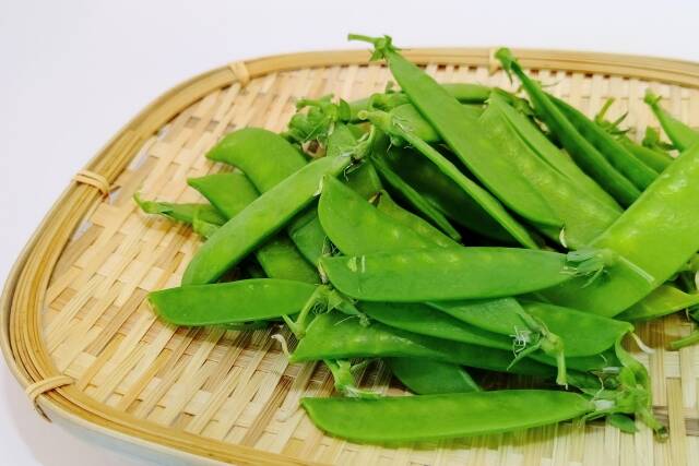 さやえんどう 旬は春から初夏です。さやえんどうは全国で栽培されハウス栽培などもあり通年手に入ります、長さ5〜7cmほどでさやが薄く、実が小さく若い状態で収穫されます。シャキッとした歯触りでほのかに甘味があり、色も鮮やかなのでちょっとしたアクセントにも便利。煮物や炒め物、汁物などによく合います。緑色が鮮やかで、水分がたっぷり含まれているしっかりとしたものを選びます。薄くてもぐにゃぐにゃ曲がるものは鮮度が落ちています。3月豆とも呼ばれます。